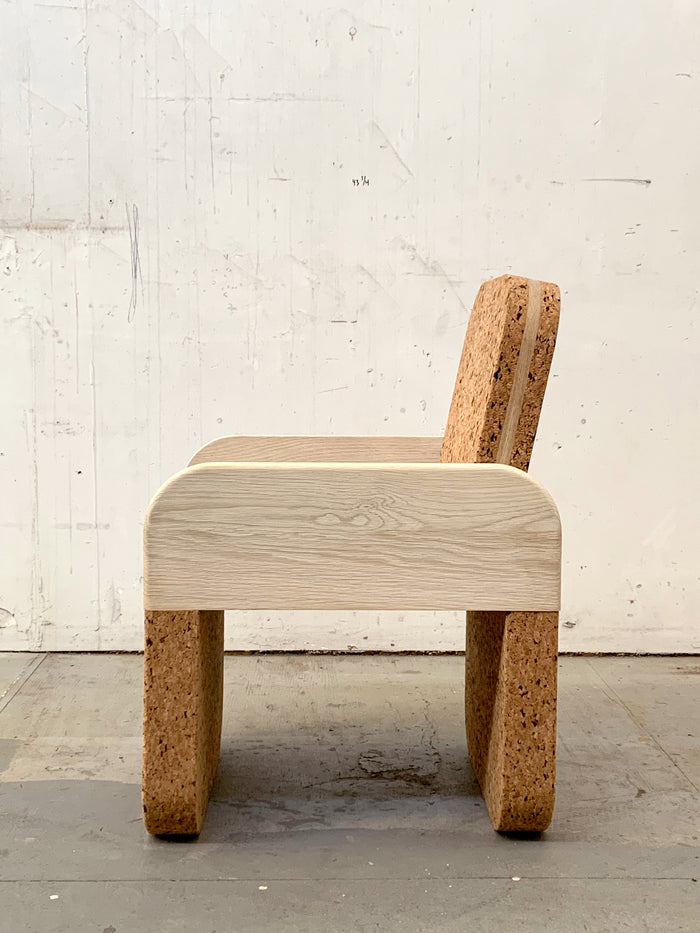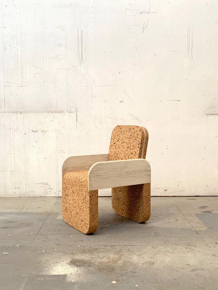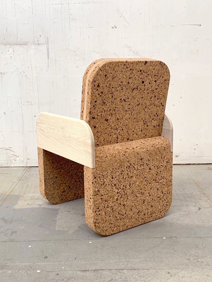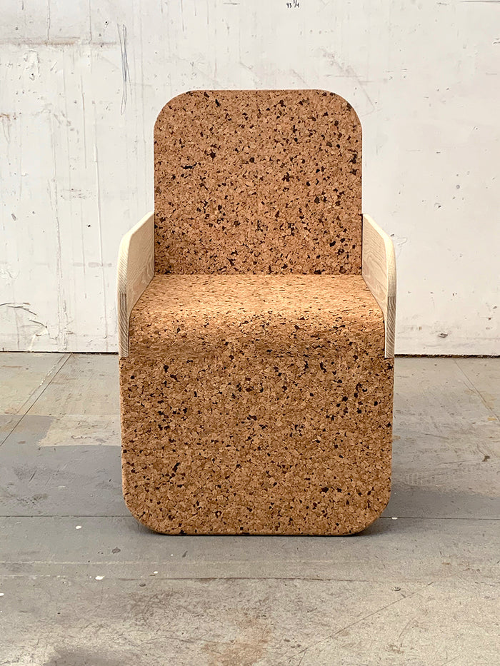 This arm chair is made from sand-colored cork that has dark flecks throughout. The arm rests are made from FSC-certified American White Oak.